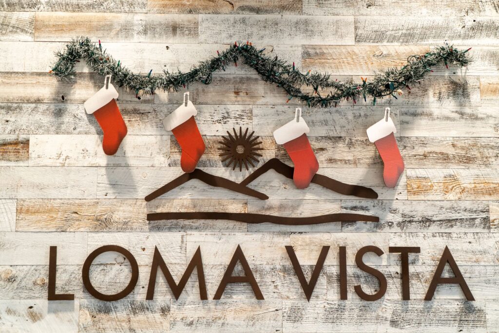A garland with four red Christmas stockings hangs above a metal Loma Vista sign on a whitewashed wooden wall.